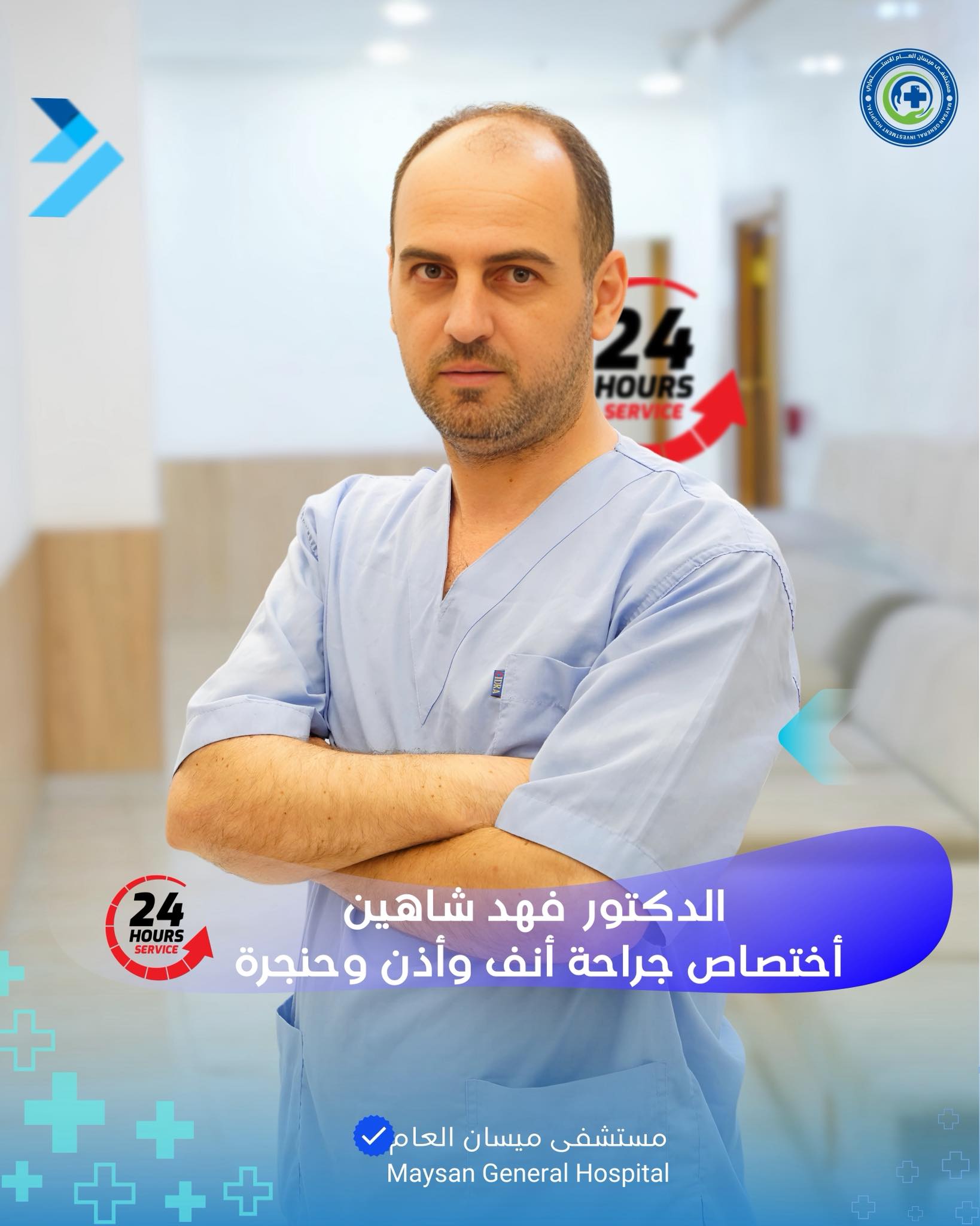 - يسر *مستشفى ميسان العام الاستثمارية* الإعلان عن تواجد الدكتور *فهد شاهين* ، *اختصاصي بأمراض وجراحة الأنف والأذن والحنجرة* ، على مدار *24 ساعة* لإجراء العمليات الجراحية والاستشاريات الطبية للحالات الطارئة. ✅ *جراحة القرينات والزوائد الأنفية* ✅ *جراحة الجيوب الأنفية باستخدام الناظور* ✅ *جراحة وتجميل الرأس والعنق* ✅ *مفاغرة مجرى الدمع على الأنف بالناظور لحالات انسداد مجرى الدمع* ✅ *جراحة أورام الرأس والعنق وتجريف العقد اللمفية* ✅ *إصلاح رتق المنخر الخلفي بالناظور* ✅ *استئصال اللوزتين والناميات* ✅ *تجميل صيوان الأذن وتصحيح بروزها* ✅ *قص الأجفان وشد الأجفان* ✅ *شد الوجه وعلاج التجاعيد* ✅ *جراحة سرطانات الجلد والتعويض بشرائح جلدية*