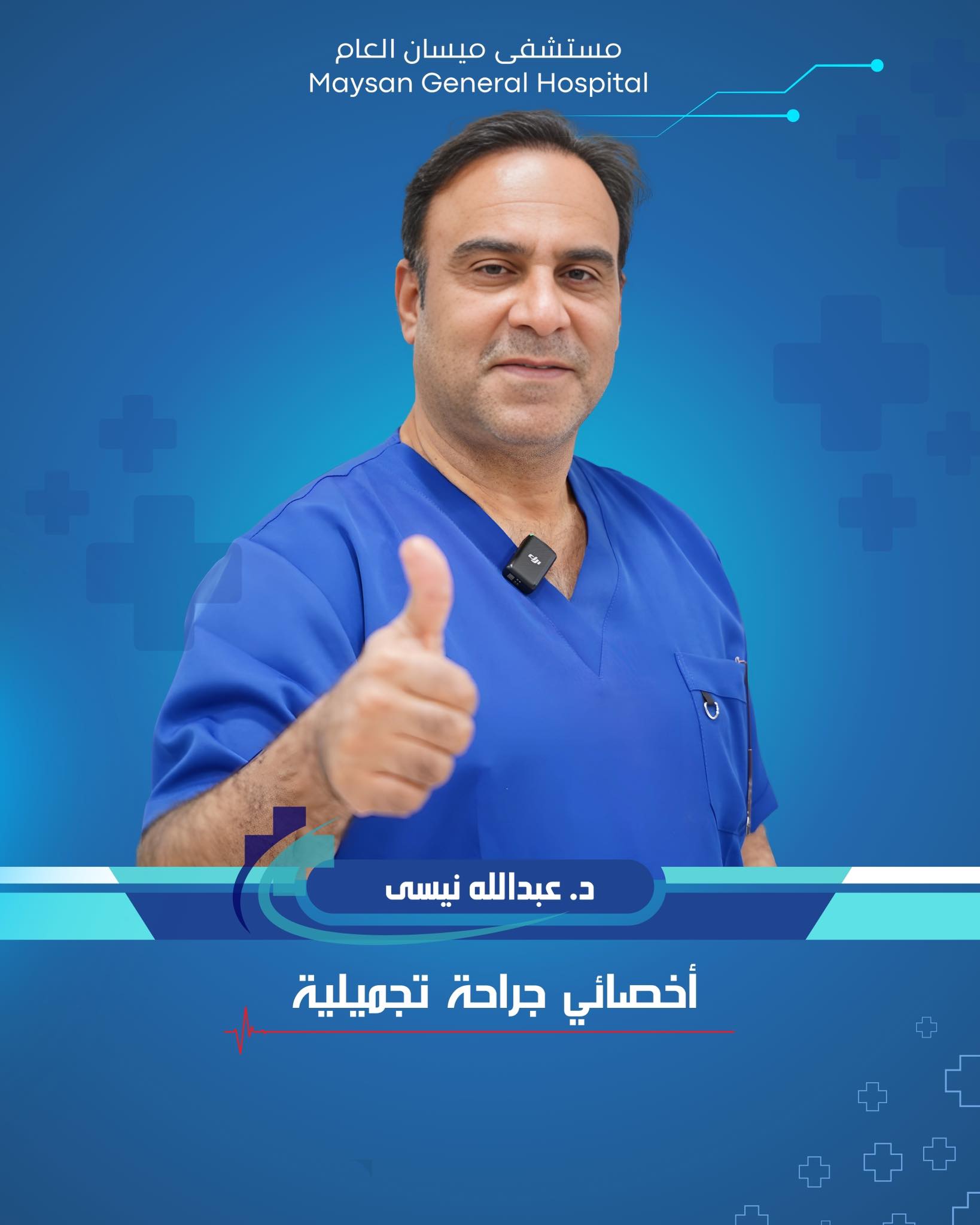 - واجد إستشارية الدكتور عبد الله نيسى أخصائي جراحة تجميلية لأجراء العمليات التجميل في أحدث صالات العمليات داخل مستشفى ميسان العام