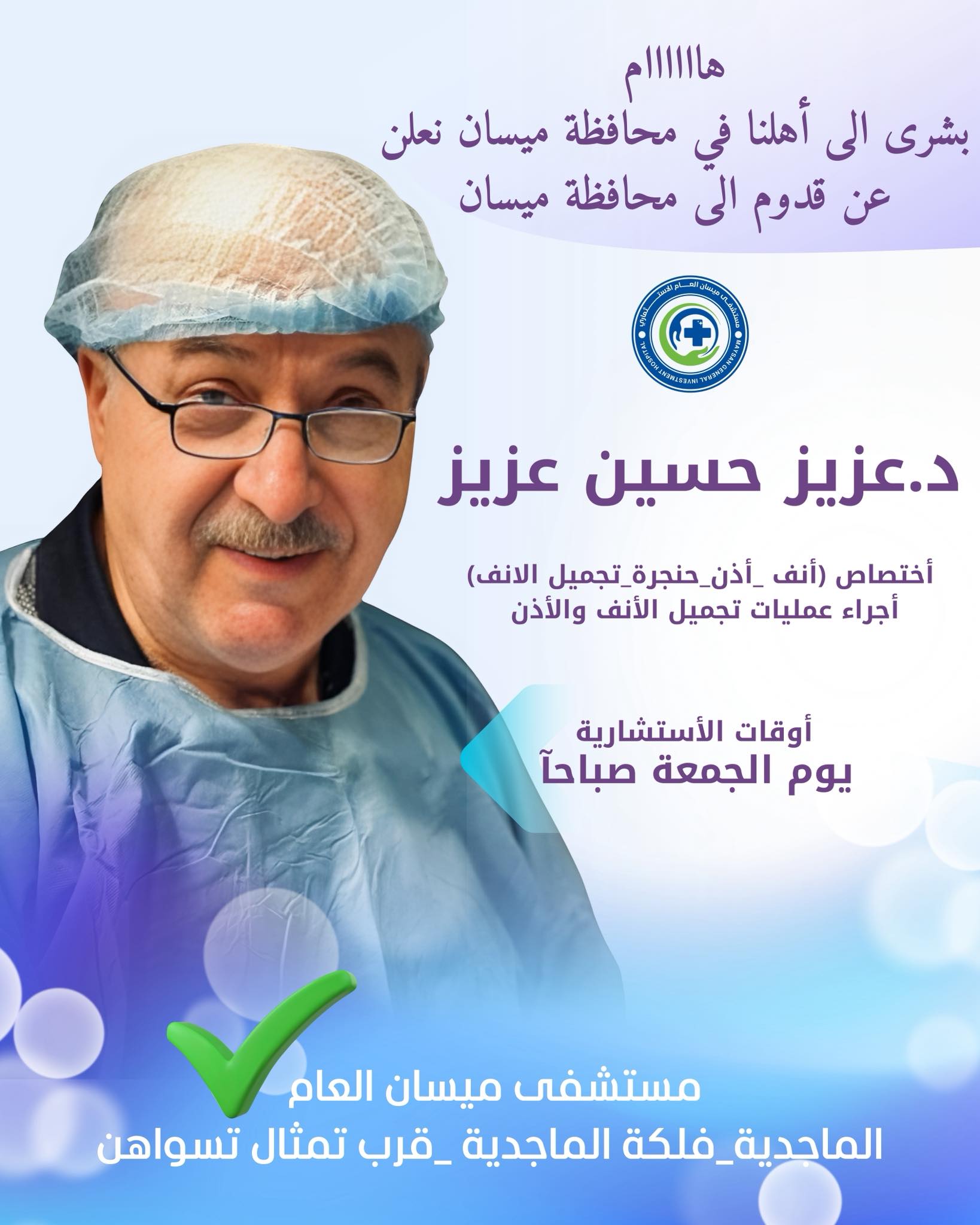 - قدوم الدكتور عزيز حسين عزيز اختصاص( أنف_أذن _حنجرة) وكما يجري العمليات الجراحية التجميلية للأنف والأذن