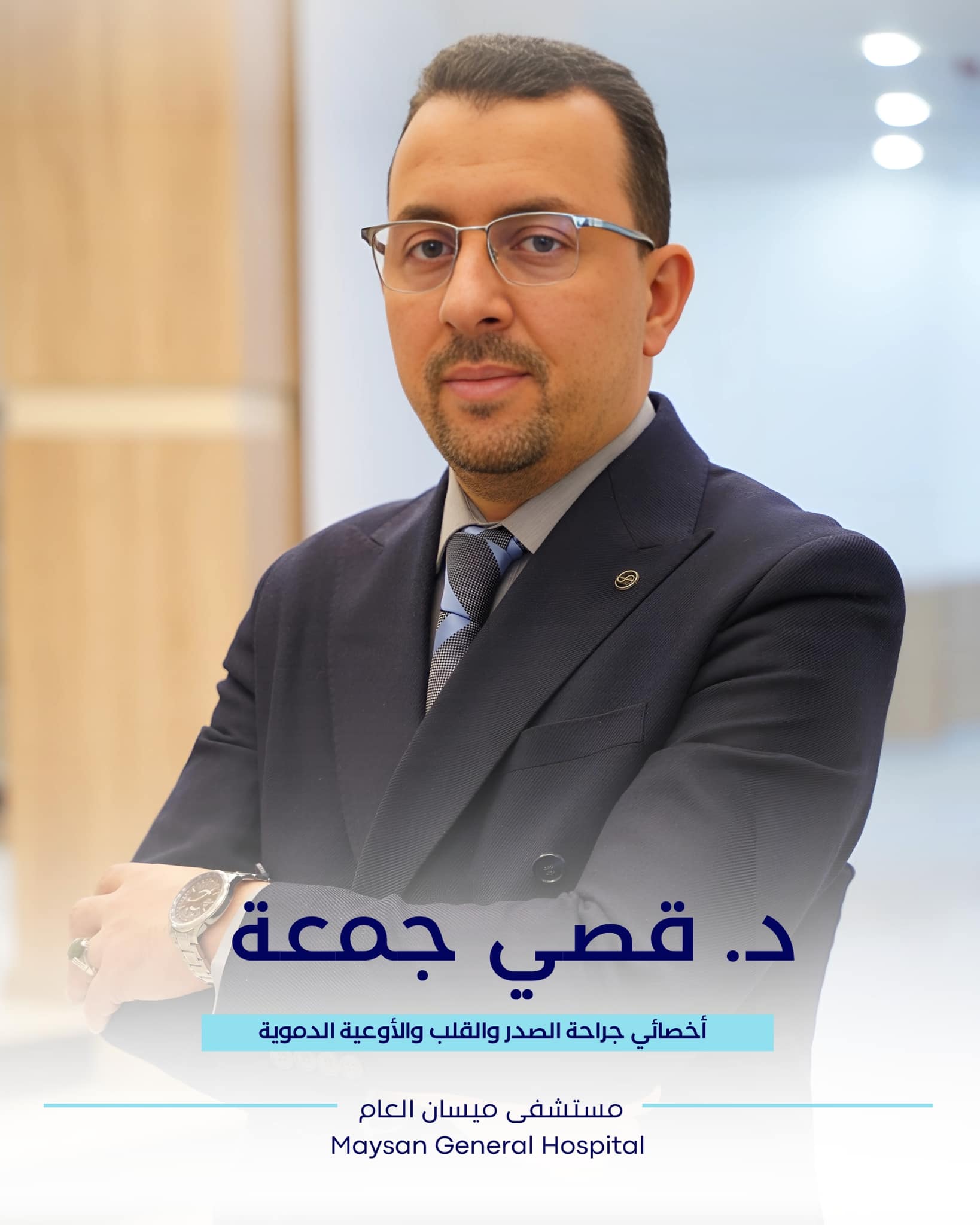 - تعلن مستشفى ميسان العام عن تواجد الدكتور قصي جمعة أخصائي جراحة الصدر والقلب والأوعية الدموية لأجراء العمليات الجراحية داخل احدث صالات عمليات في محافظة ميسان