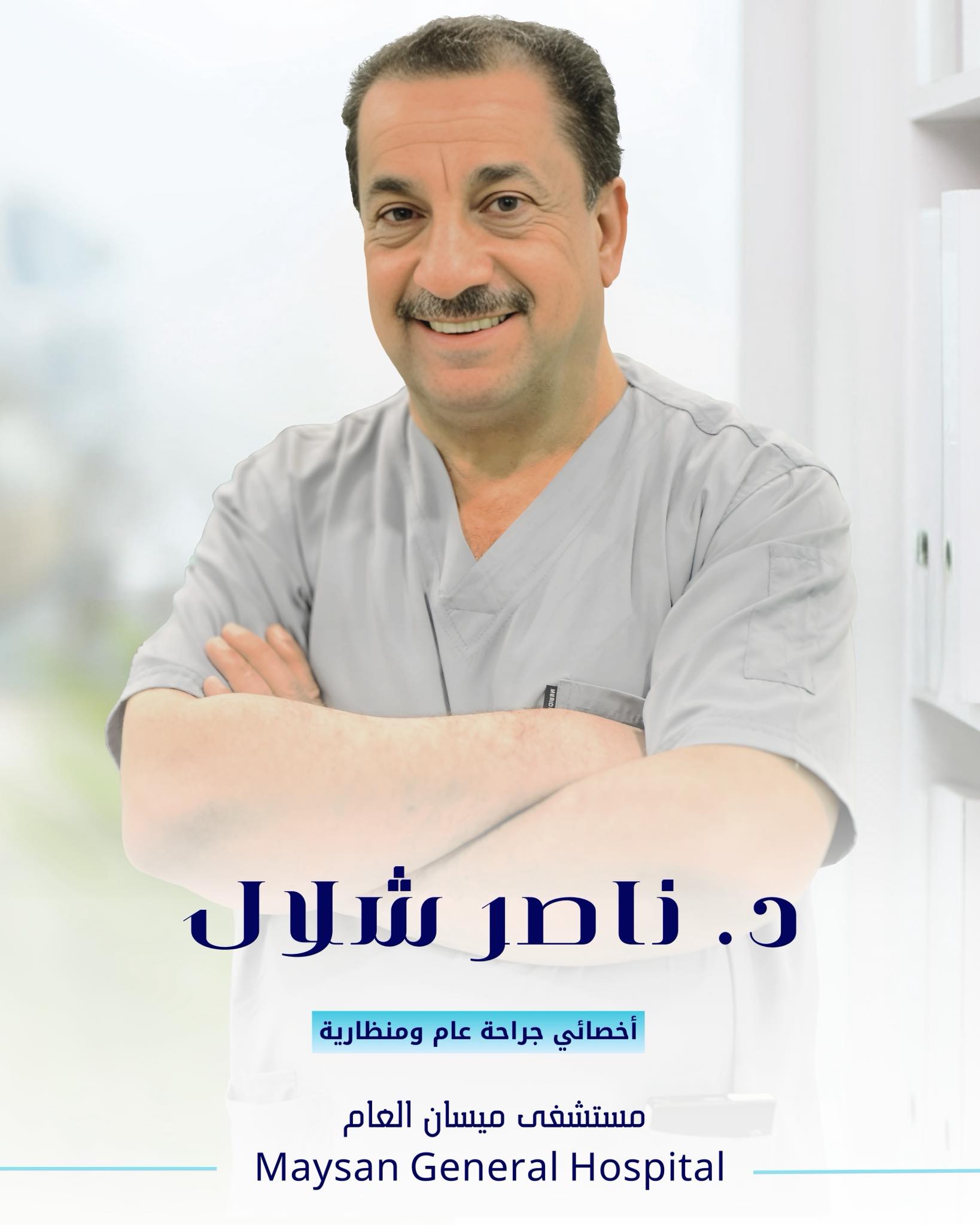 - تواجد الدكتور ناصر شلال أخصائي جراحة عامة ومنظارية لأجراء العمليات الجراحية داخل أحدث صالات العمليات في مستشفى ميسان العام