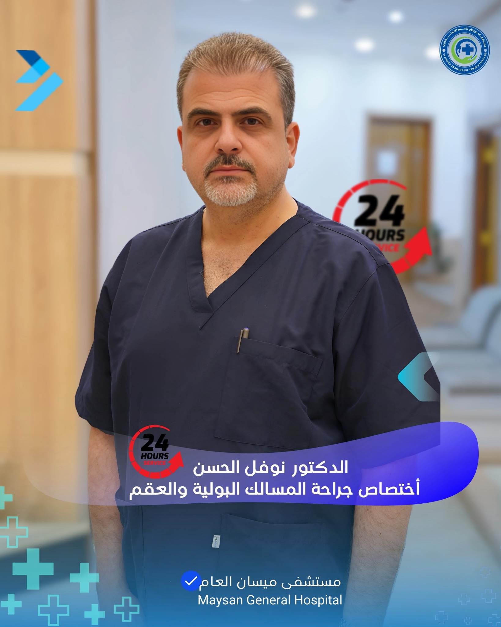 - يسر *مستشفى ميسان العام* الإعلان عن تواجد الدكتور *نوفل الحسن* ، *اختصاصي جراحة المسالك البولية والتناسلية والعقم والضعف الجنسي وأمراض الذكورة* ، على مدار *24 ساعة* للحالات الطارئة والاستشارات الطبية وإجراء العمليات الجراحية. ✅ *تشخيص وعلاج الالتهابات البولية* عند الجنسين. ✅ *تشخيص وعلاج أمراض البروستات*. ✅ *تشخيص وعلاج الحصيات الكلوية والحالبية*. ✅ *تشخيص وعلاج الضعف الجنسي والعقم عند الذكور*. ✅ *تشخيص وعلاج السلس البولي والمثانة العصبية*. ✅ *تشخيص وعلاج دوالي الخصيتين*. ✅ *تشخيص وعلاج الأمراض المنتقلة عبر الجنس*.