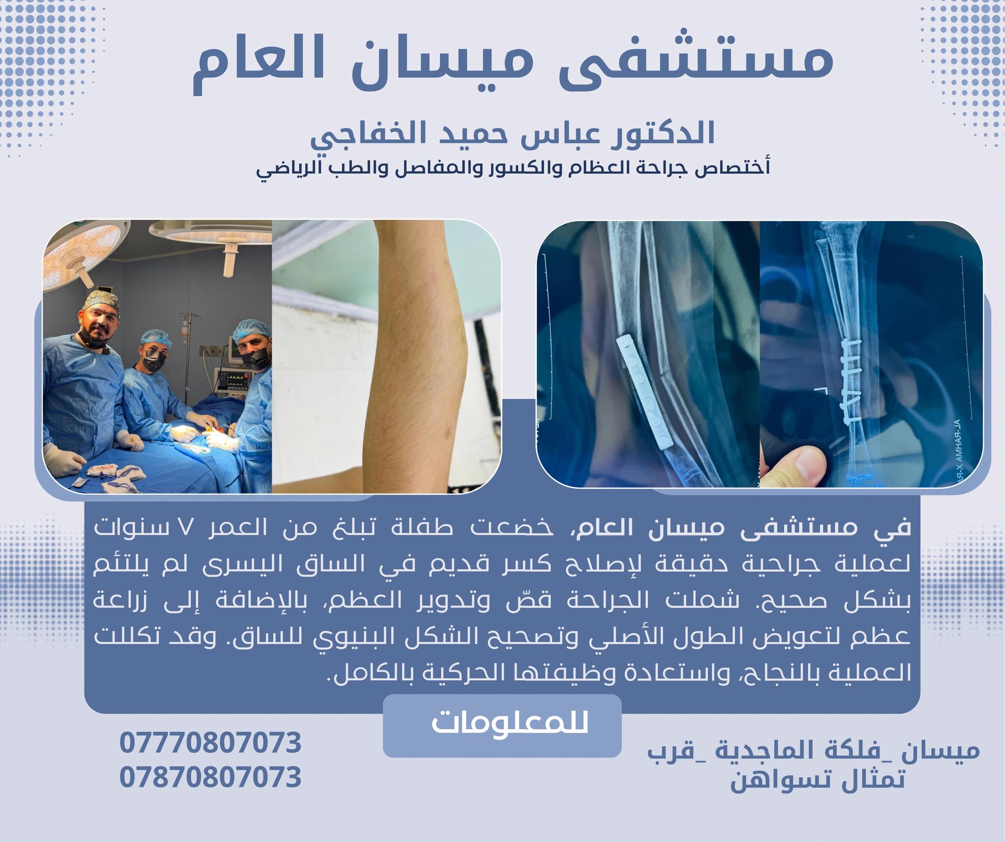 مستشفى ميسان العام خضعت طفلة تبلغ من العمر ٧ سنوات لعملية جراحية متقدمة في الساق اليسرى على يد الدكتور عباس حميد الخفاجي، أخصائي جراحة العظام والمفاصل والطب الرياضي، وذلك نتيجة كسر سابق لم يلتئم. شملت العملية قصّ وتدوير العظم مع زراعة عظم لاستعادة الطول الأصلي وتصحيح التشوّه العظمي، وقد تكللت بالنجاح.