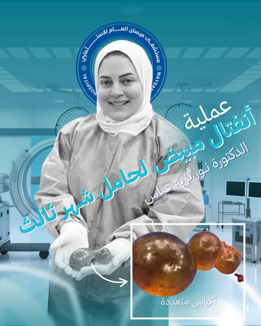 خلال زيارة الدكتورة نور نزيه عباس* ، _اختصاصية النسائية والتوليد الى مستشفى ميسان العام، تم إجراء تدخل جراحي دقيق لإنقاذ مبيض مريضة حامل بالشهر الثالث، بعد تعرضه لانفتال ناتج عن وجود أكياس متعددة.